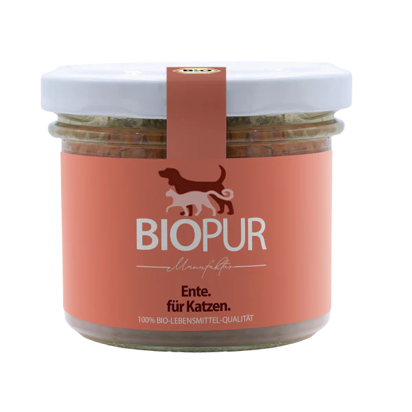 BIOPUR Premiumglas Ente kombiniert saftiges Bio-Entenmuskelfleisch mit nährstoffreicher Bio-Entenleber und feinem Bio-Kürbis – ideal für Katzen, die eine gut verträgliche und ausgewogene Ernährung schätzen. Hochwertige tierische Proteine liefern wertvolle Energie, während Lachsöl, Katzenminze und ausgewählte Mineralstoffe die Nährstoffversorgung sinnvoll ergänzen. Die schonende Bio-Rezeptur überzeugt durch ihren natürlichen Geschmack und hohe Akzeptanz.